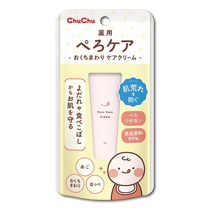 食べこぼしやよだれなどによる刺激、赤ちゃんが「ぺろぺろしやすい」あごや口まわり、ほっぺなどをケアする「薬用ぺろケア」クリーム。