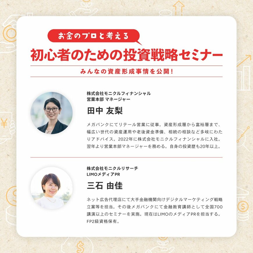 現場のリアルな声なども交えつつ、初心者のための投資戦略を解説していただきます。金融教育の専門家であるLIMOメディアPRの三石由佳との本音対談も予定しておりますので、お楽しみに!