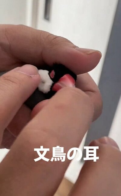 飼い主さんが、文鳥の目の後ろにある羽を、そっと指でよけてみます。
