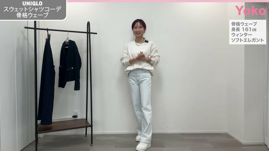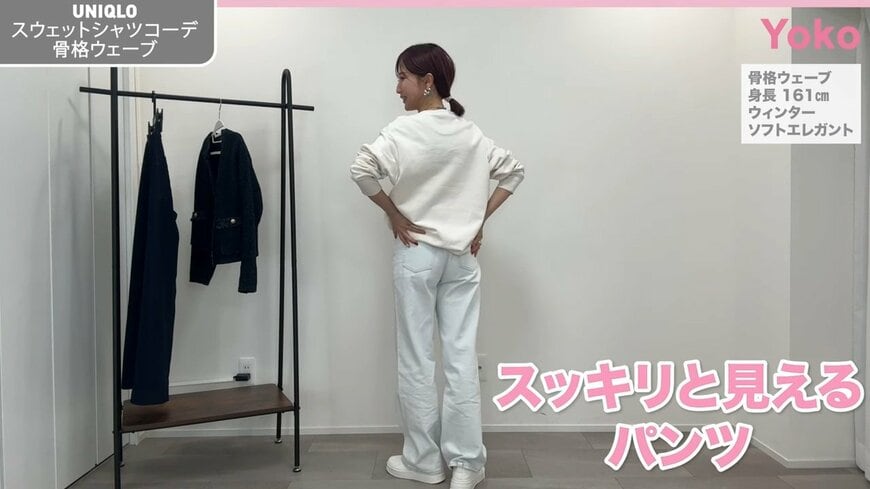 ヨーコさんのスウェットトップスの着こなしはこちら。全身ホワイトトーンでまとめ、すっきり爽やかな大人のカジュアルスタイルです!