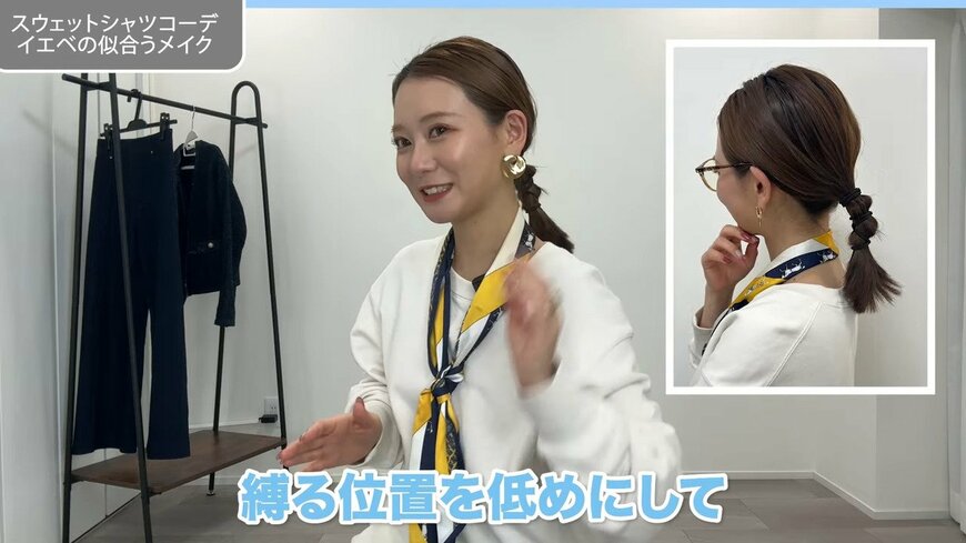 メイクはコーディネートに合わせて、なるべく薄め、カジュアルにするのがポイントです。髪型はカジュアルに見せるため、低めのまとめ髪にしています。2つのゴムを使って、動きを出しているそうです。