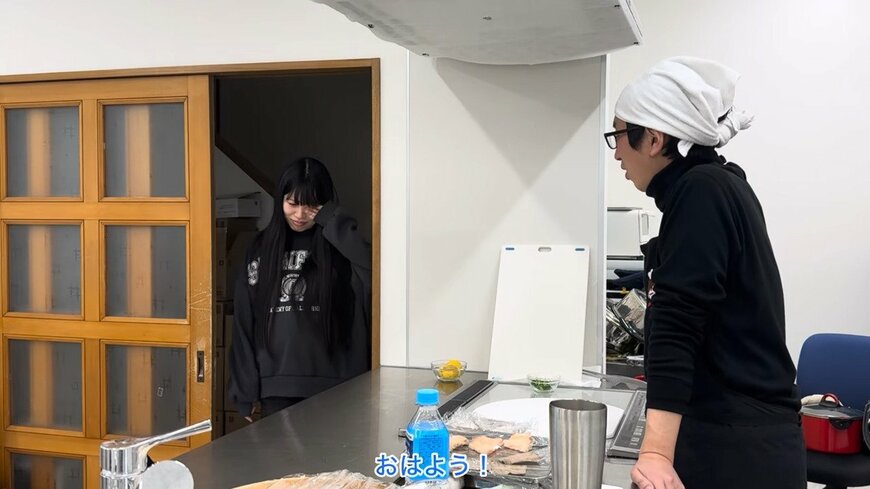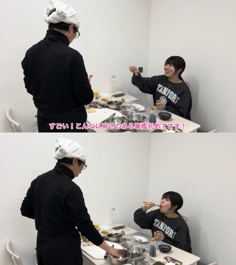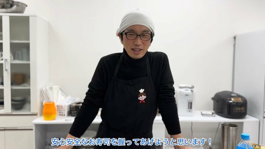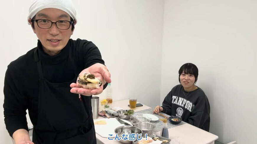 動画の内容をご紹介します。50歳の年上夫・みっちゃんさんが登場。妊娠中の23歳妻・ともえさんのために「みっちゃん寿司」を”開店”。魚に火を通すなど下準備をして、起きてきたともえさんを出迎えます。