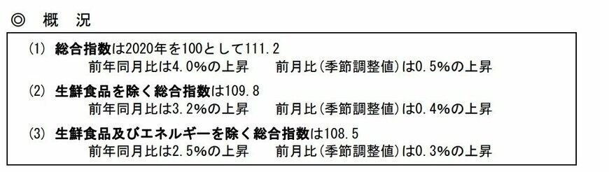 2025年2月21日、総務省は「2020年基準 消費者物価指数 全国 2025年(令和7年)1月分」を公表しました。すべての商品を対象とする「総合指数」は2020年を100として111.2となり、前年同月比は4.0%上昇となりました。