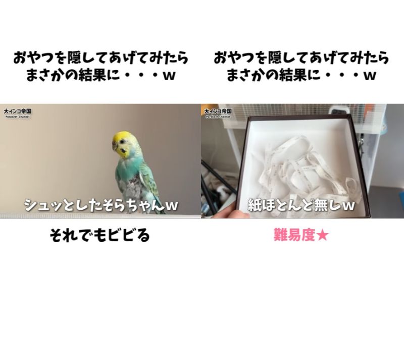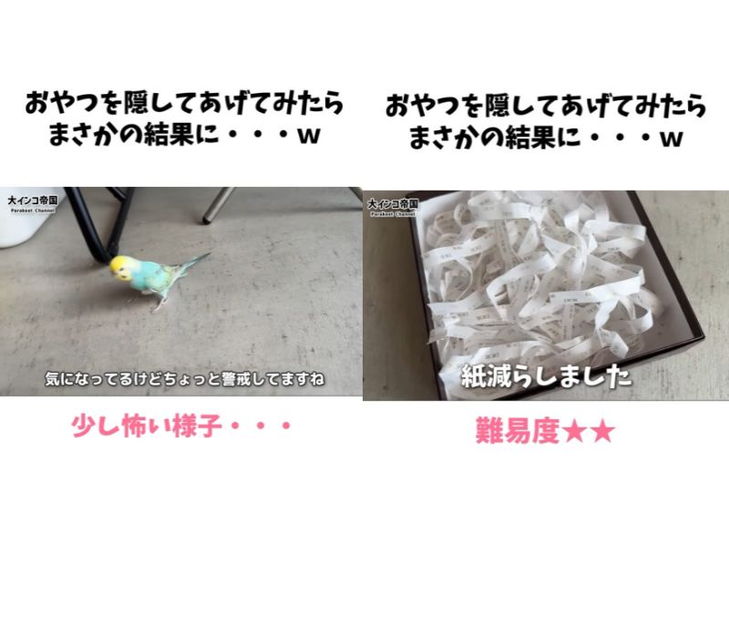 2. 【インコとおやつ】「ちょっと怖いふり」をして、難易度を下げてもらう作戦?のセキセイインコ