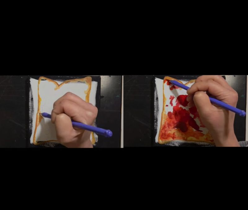 そんな気合の入ったコメントと共に、「いちごジャムトースト」の絵を描き始めた山田さん。ピザトースト、ベーコンエッグトースト、明太チーズトーストに続いて、4枚目のトーストを作り(描き)はじめました。