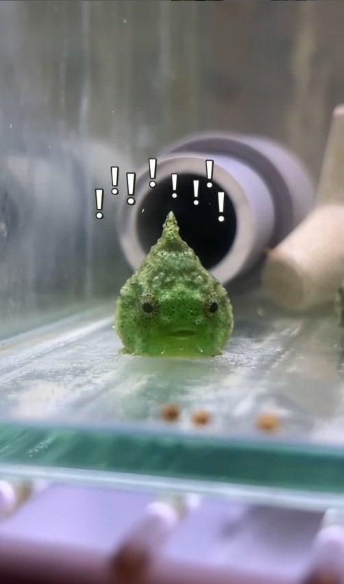 「一度にたくさん食べすぎて、一度吐き出すもすぐに食いつく欲張りっぷり」と投稿された動画では、緑色のダンゴウオが登場。少しとぼけたような表情がかわいらしいです。目の前にエサが3粒転がってくると…。
