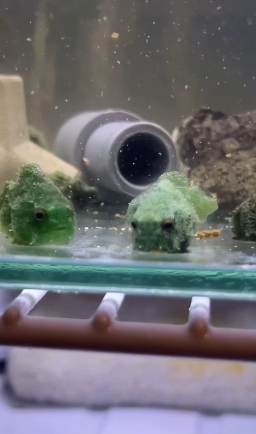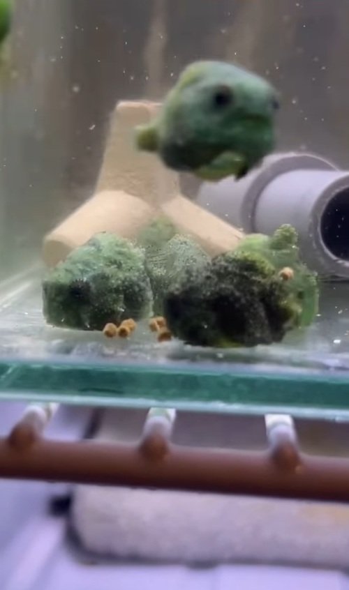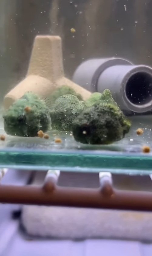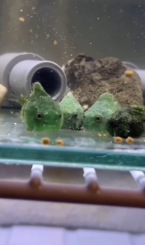 水槽の下の方では、別のダンゴウオちゃんたちがぱくぱくと食べています。横に並んで食べる姿はまるで串だんごのよう!その姿に癒されますよ。