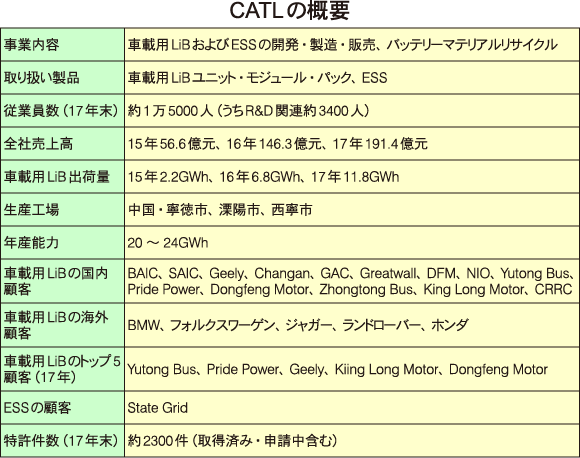 CATLの売上高は15年が56.6億元、16年が146.3億元、17年が191.4億元(約3200億円)。また、車載用LiB出荷量は15年が2.2GWh、16年が6.8GWh、17年が11.8GWhと飛躍的に増加している。そして、17年末までに累計30万2000台の車両に搭載された。