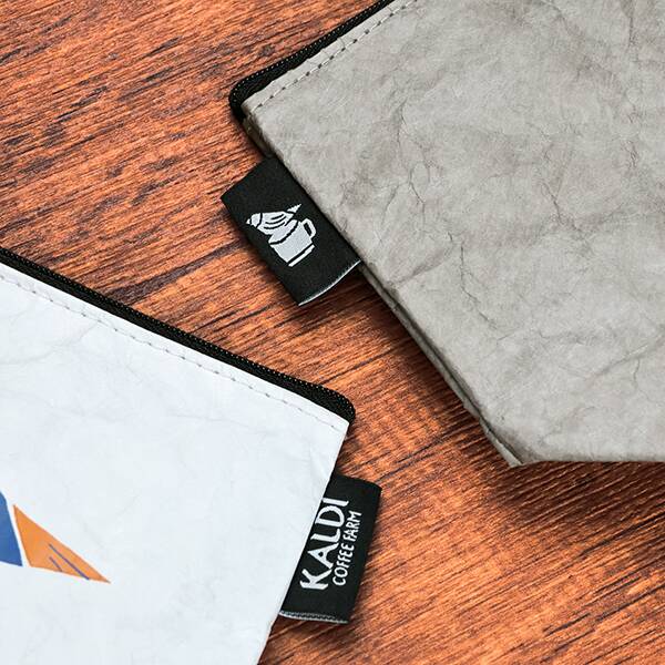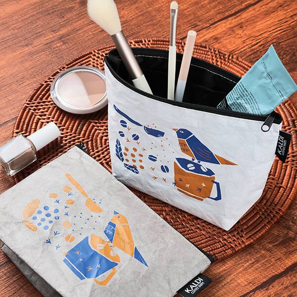 コーヒーカップと小鳥のイラストをデザインしたポーチは、まるで紙のように見えるしわ加工が味のある風合い。この素材は、高密度ポリエチレン製の不織布でできていて、軽量で通気性と耐水性があり、使い込むほどにしわや風合いが出てくるのも特徴のひとつです。ポーチの内側は便利なポケット付きで使い勝手も抜群です。