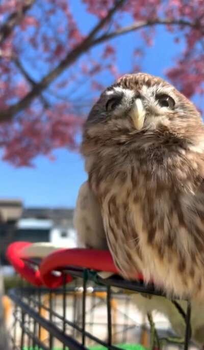 3. 【お花見をするフクロウ】ベレー帽を脱いでもキリっと引き締まった表情は変わらない!