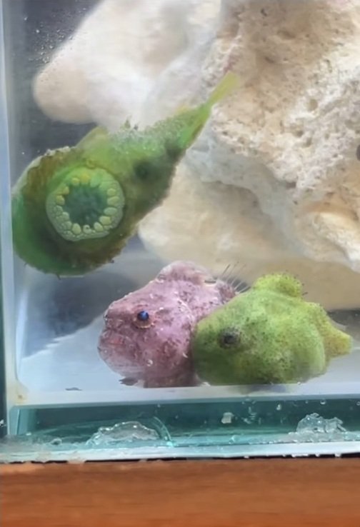 チュッと口づけたのかと思いきや、ガブッと噛みついている!?だんごむすめさんによると、「じつはくっついている子の胸ビレを狙っています 胸ビレがヨコエビに見えたんでしょうね 赤ちゃんの頃は、よく他の子の尾ビレを間違えて食べちゃっていました!こんなお茶目な子達可愛すぎる〜♥」とのこと!