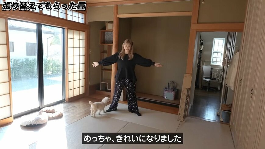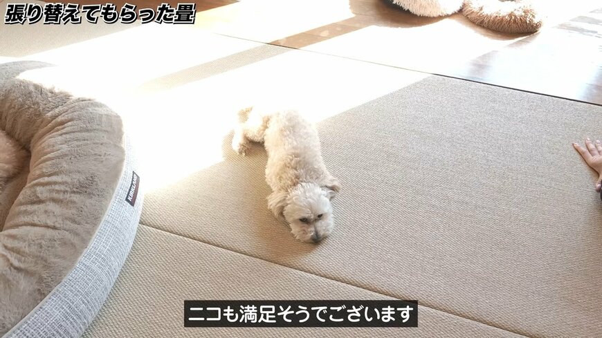 まずは張り替えた畳を紹介。イグサを使った通常の畳ではなく「ビニール畳」のものを選ばれたそうです。撥水性のある素材で、わんちゃんが間違えて畳の上でトイレをしてもOKです。