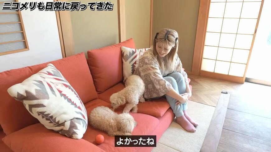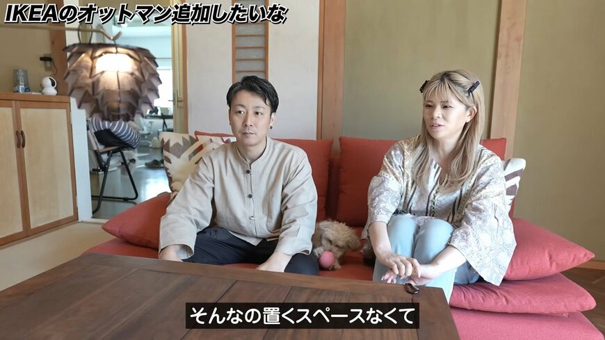 そして赤のローソファーとテレビ、机などを設置し、愛犬も含めた家族全員でくつろげるおしゃれな和室が完成しました!ニコちゃんもメリーちゃんも大喜び。お二人もつられて笑顔になる幸せ空間になりました。
