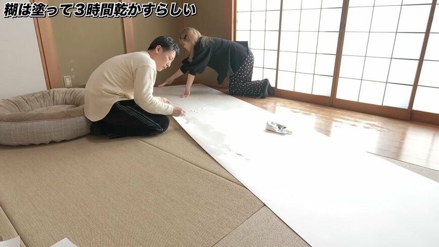 そして縁側のフローリング部分にクッションフロアシートを貼っていきます。お二人が選ばれたのはヘリボーン柄。焦げたり虫食いされていたりと傷んでいた部分を隠し、モダンな部屋へと様変わりしました。