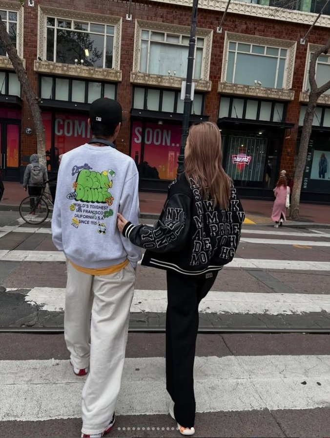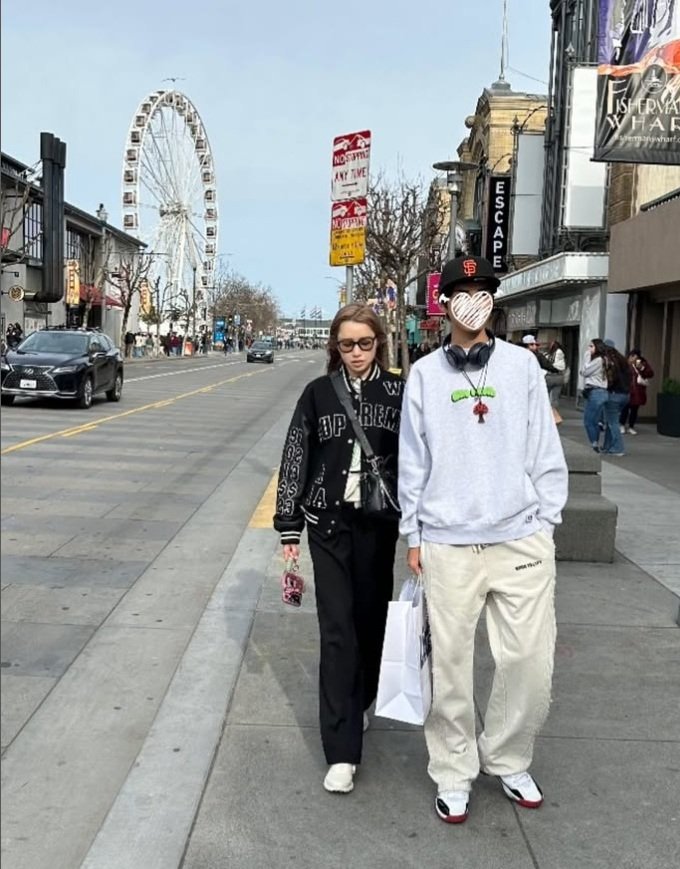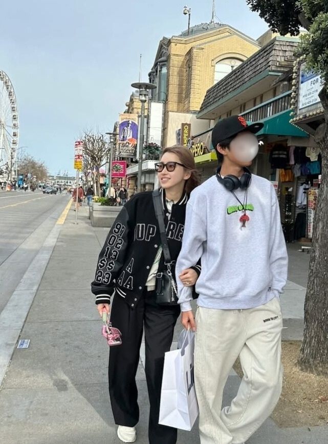 おしゃれなサンフランシスコの街並みを歩く、仁香さんと息子さん。モデルの仁香さんのスタイルを受け継いだ高身長で、2人ともスタイル抜群です。顔は隠されていますが、顔も小さく、ストリートファッションがおしゃれ。
