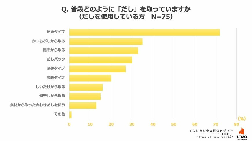 かつおぶしや昆布からだしを取る人も3割強いる一方で、粉末タイプのだしを使う割合は7割を超え、群を抜いてトップに。
