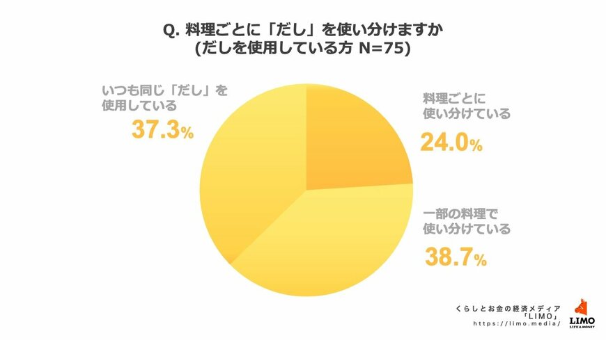 「料理ごとに使い分けている」と回答した24.0%と合わせると、半数以上の62.7%の人がだしを使い分けていることが読み取れます。