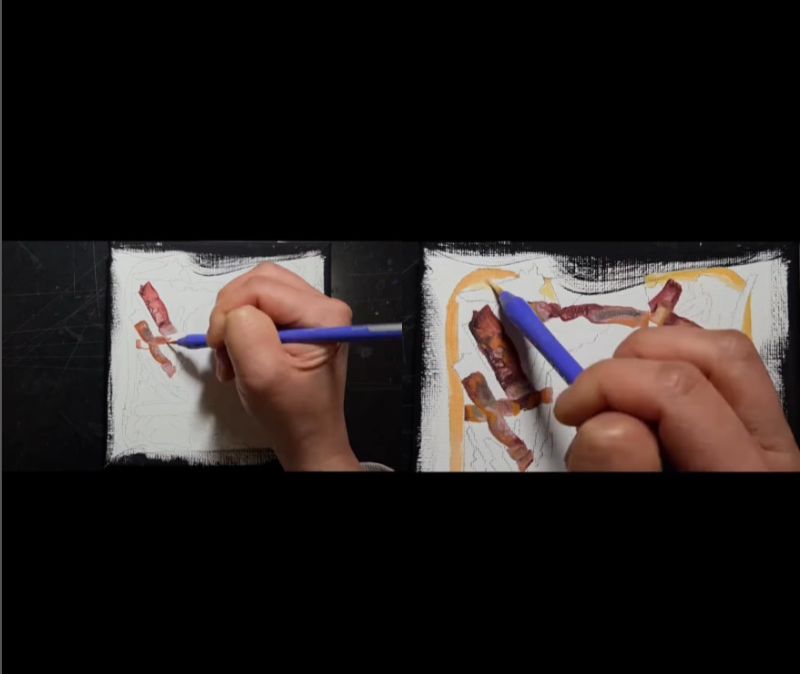 お!今回描き始めるのは、いつもの「キツネ色の耳の部分」ではなく、なんとベーコンからスタートされるようです。