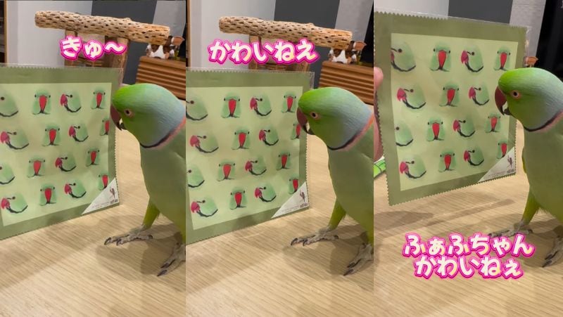 ワカケホンセイインコのファフちゃんが、自分のイラストが描かれているメガネクロスと、自分以外のインコが描かれているメガネクロス、態度を豹変させる動画話題です。投稿されたのは「@zundamame_cockatiel」さん。