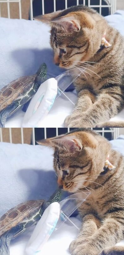 1. 【猫に恋する亀】クサガメの軍曹くんは猫の小雪ちゃんが大好き!たくさんチューしちゃいます