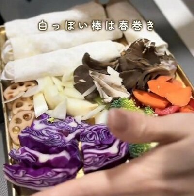 盛り付けたら、春巻きや野菜たちを詰めていきます。