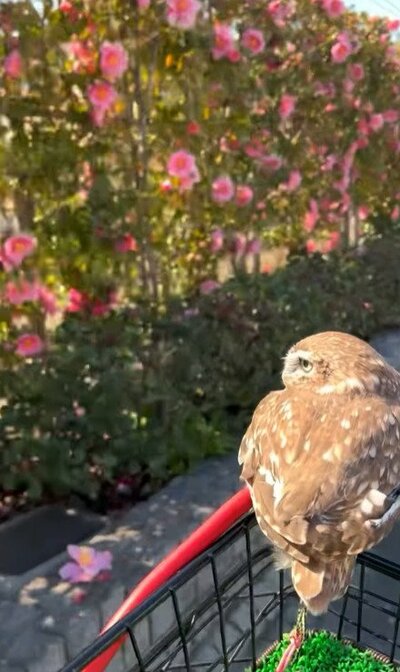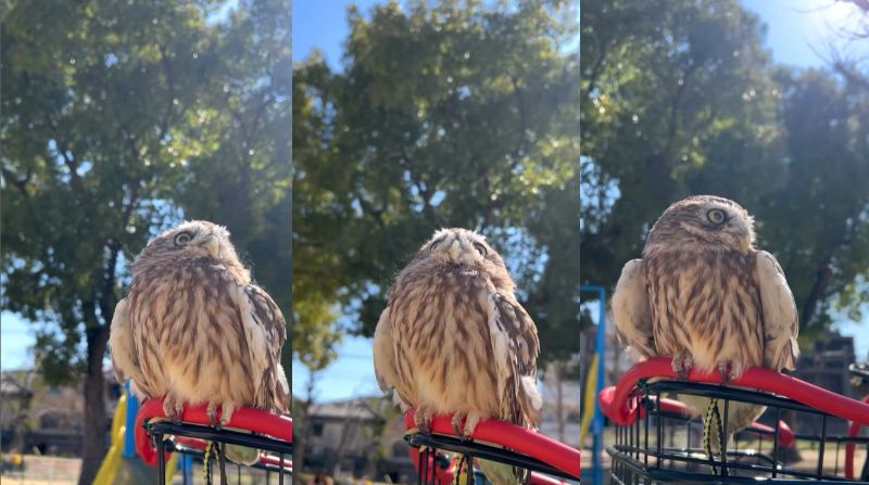 2. 【サイクリングを楽しむフクロウ】空を見上げるフクロウさん。青空を仰ぐ姿もサマになる!