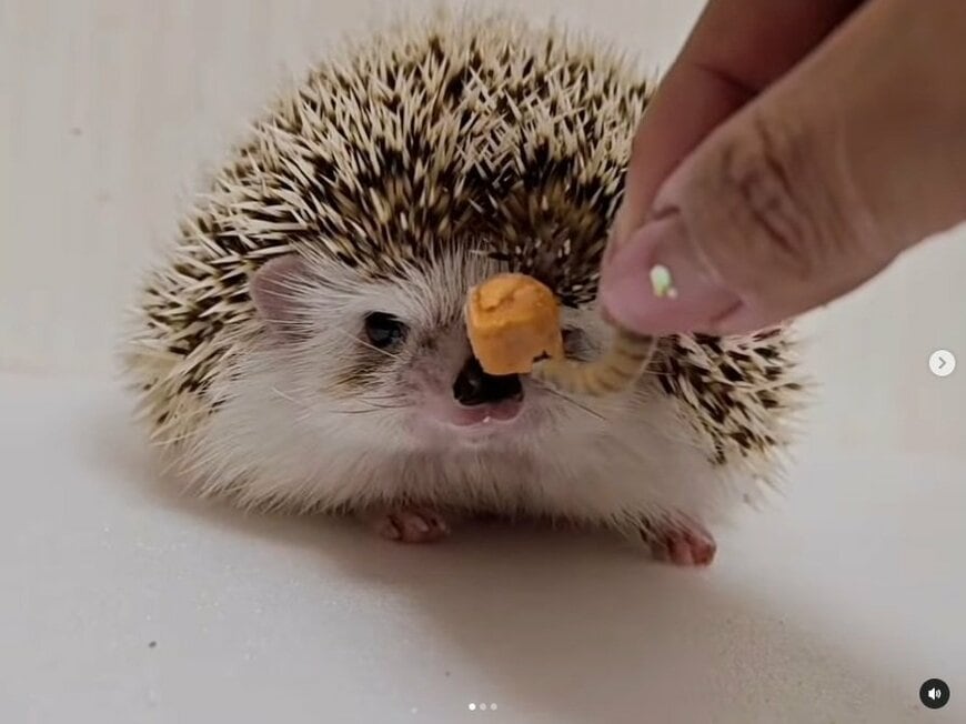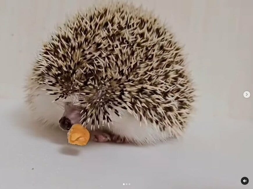 2. 【針におやつを刺して保存するハリネズミ】今度はおやつが邪魔でエサが食べれません!小さくなるうずらくんがかわいすぎる