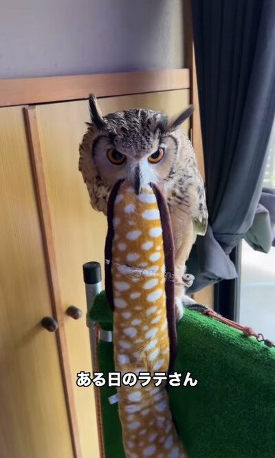 ベンガルワシミミズクのラテちゃんは、ばあちゃんが大好きなことで知られていますが、ぬいぐるみも大好きな様子。