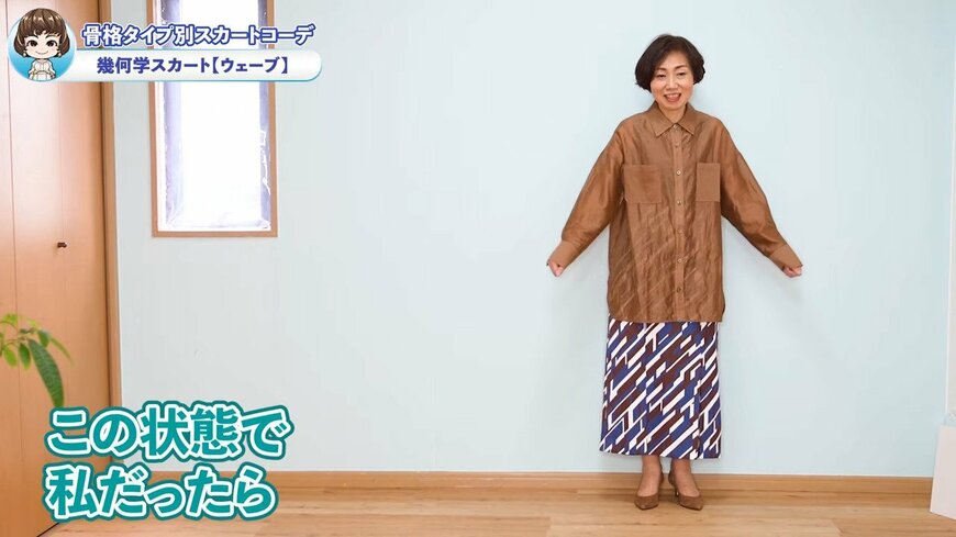 茶色のロングシャツに幾何学模様のスカートで登場した石田さん。骨格ウェーブの石田さんは、そのまま着るとだぼっとした印象ですね。自分の体型に似合うように着方を変えていきます。