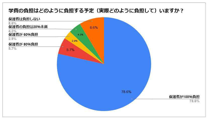 こちらは、学費より約1割減の7割の親が100%の負担をしている(する予定)であることがわかりました。