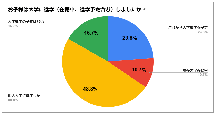 過去にお子様を大学に進学させていた人、在籍中の人、進学を予定している人を含めると、83%の方が、お子様が大学に進学している(予定である)ことがわかります。