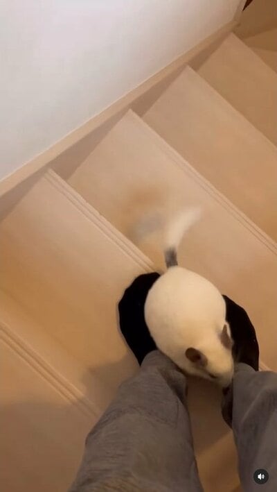 しらこくんはまた階段を降りて上ってを繰り返し、最後は飼い主さんの足の上へ。飼い主さんへの愛が伝わってきますね!そしてすたこらと階段を降り、飼い主さんもしらこくんを追いかけていました。