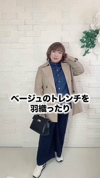 ベージュのトレンチコートやスカートなど、黄色味の感じるアイテムを合わせるのがおすすめ。黄色は青の補色なので、お互いの色を引き立てあい、おしゃれ見えが叶います。ネックレスやブローチなどで光をプラスすることも重要です。