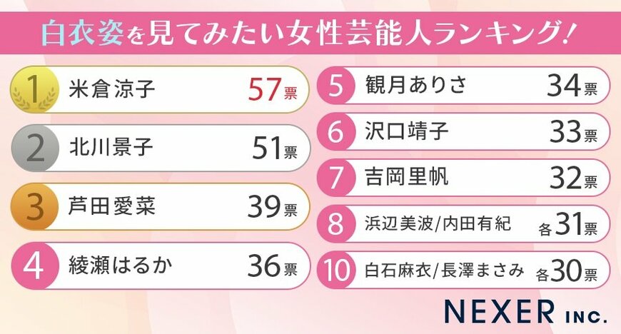 4. 【白衣姿を見てみたい女性芸能人ランキング】1~3位を紹介。