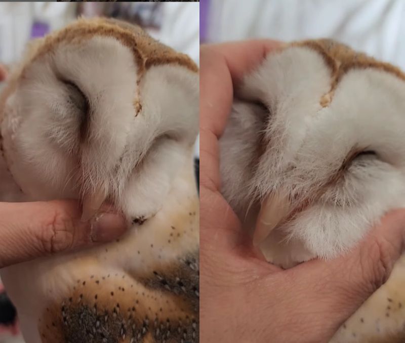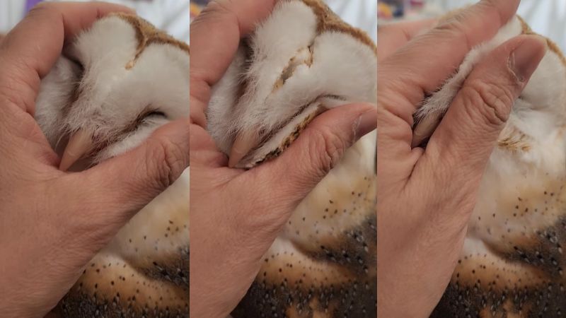 2. 【おにぎり?になるメンフクロウ】終始目を細めているメンフクロウ、とっても気持ちよさそうです