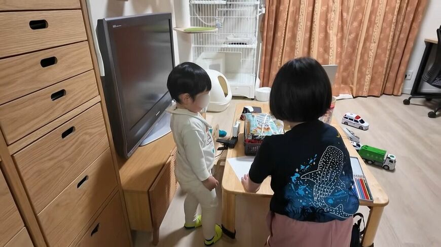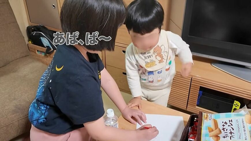 みゆかさんとの年の離れた8歳の妹・かいちゃんはハル君とお絵描きで遊んでいます。大好きなアンパンマンを描いてほしいハル君が、「あぱあぱあぱあぱ…」とあぱ(アンパンマンのこと)を連呼しだすと、かいちゃんはギブアップ。