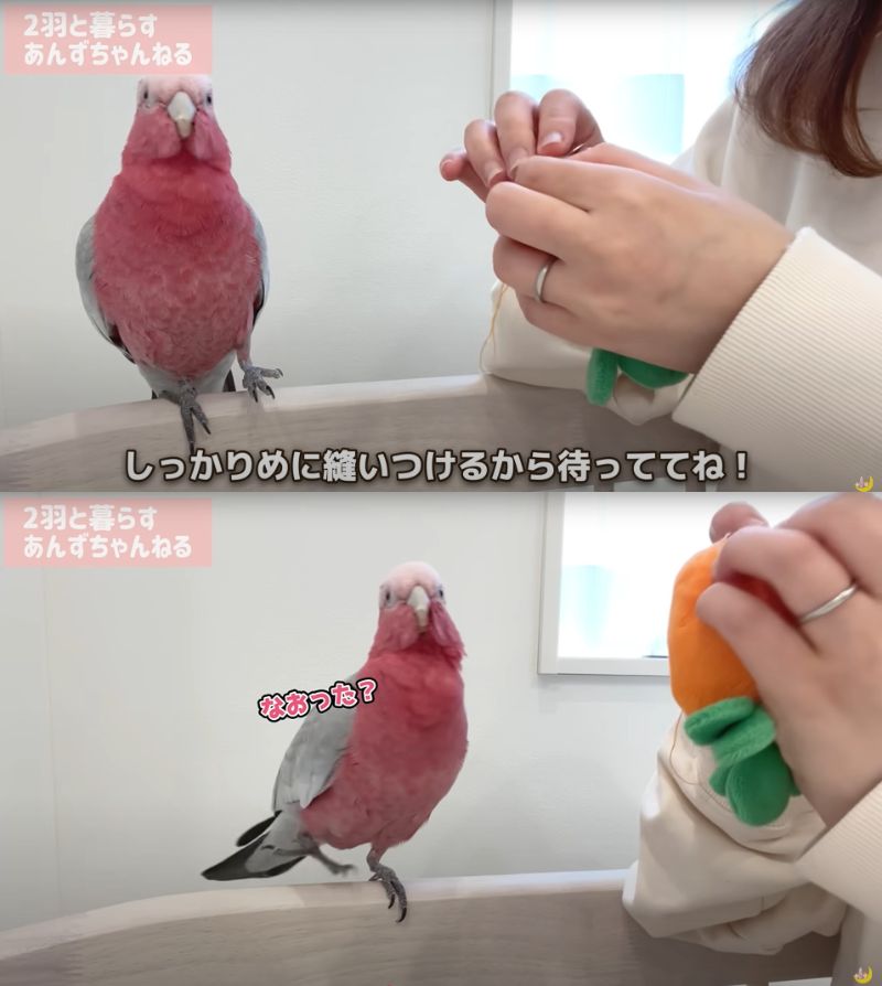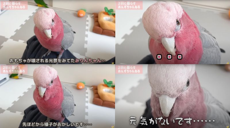 2. 【ショックを受けるインコ】茫然自失の姉インコ「なんで?なんであたしのお気に入りを破壊するの?(涙目)」
