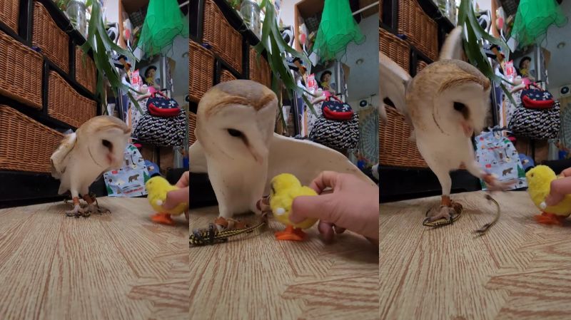 メンフクロウのとわちゃんが、おもちゃのひよこにびっくりして引いてしまう動画が話題です。投稿されたのは「@miki4wan108」さん。