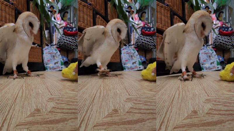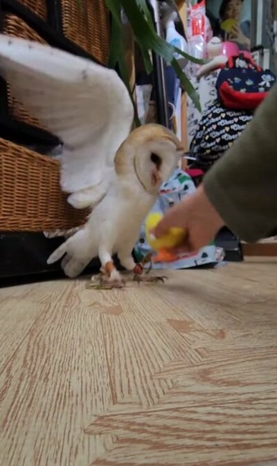 2. 【メンフクロウvsひよこちゃん】「強気になったひよこ」にドン引きするメンフクロウ