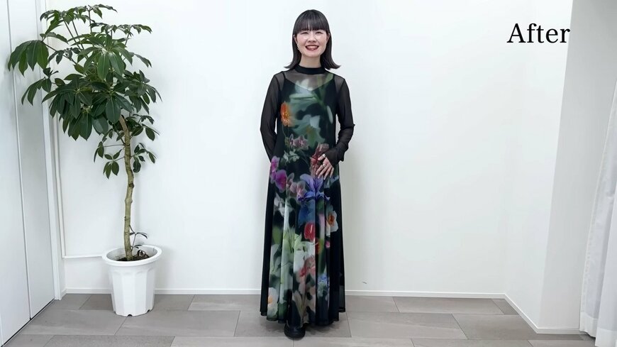 ビフォーアフターがこちら。相談者さんの柄アイテムが好きだという好みを生かしながら、大人っぽくアップデート。おしゃれな大人のお姉さんのような雰囲気へと大変身しました!