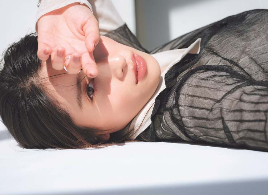 豪華韓国付録BOX版は一転、ハンサムな雰囲気。シアー素材のシャツコーデに、濃い赤のリップが印象的。こちらを見つめる視線から目が離せません。
