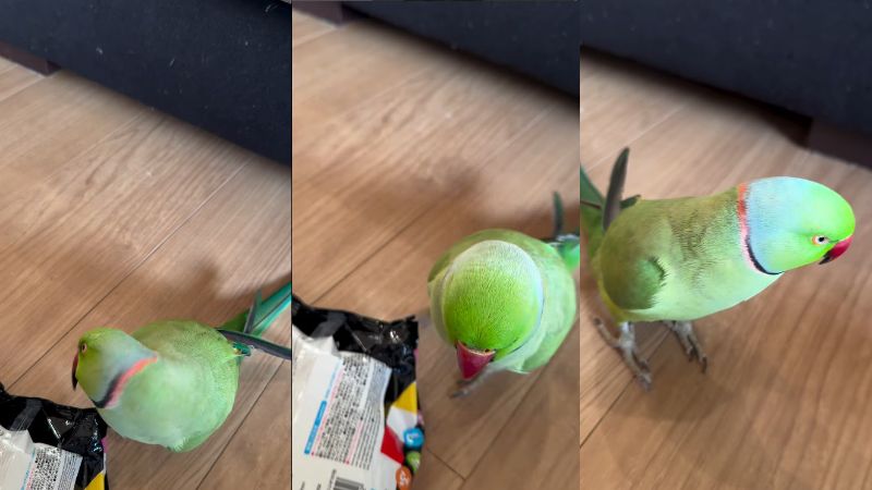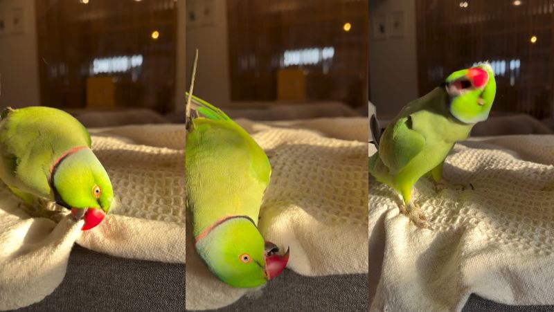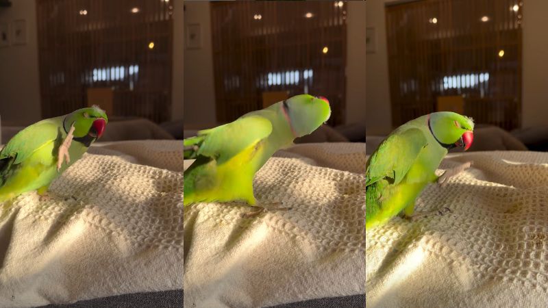 3. 【頭上の羽と格闘するインコ】あ、ついに羽が取れた!(笑)