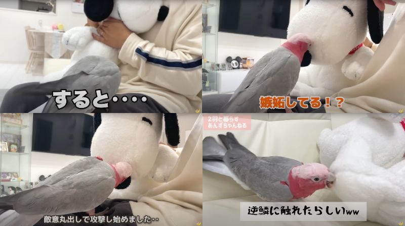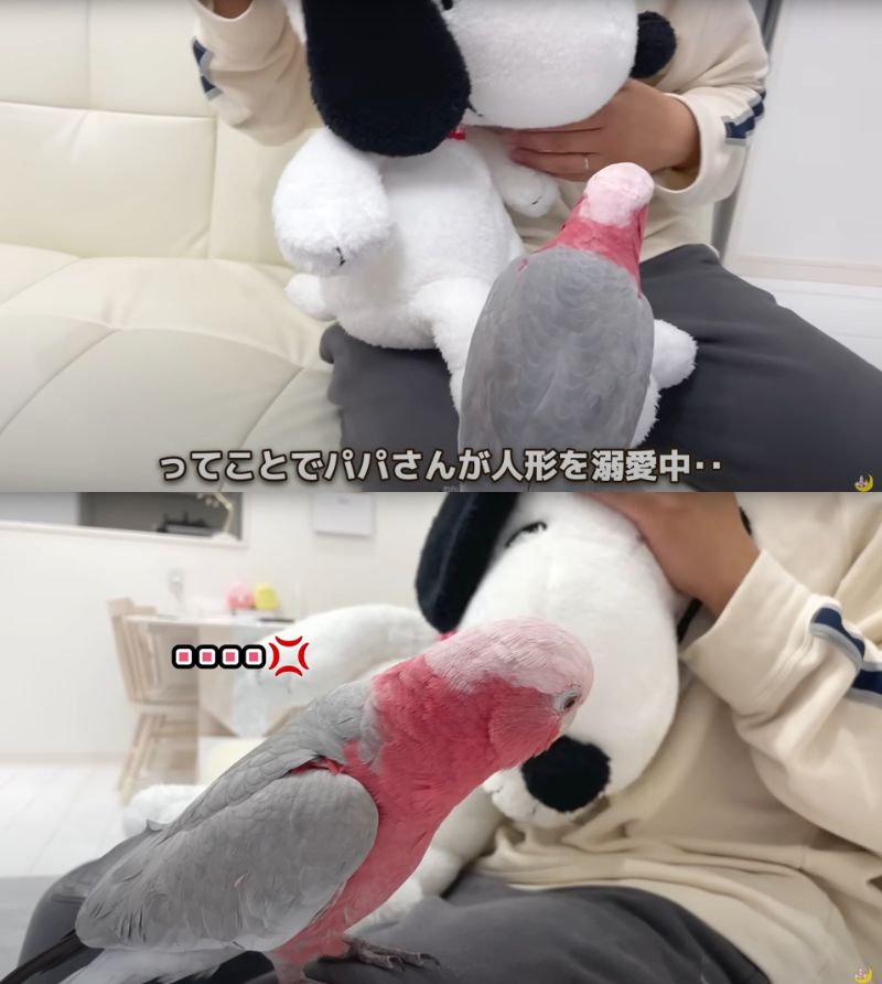 2. 【ぬいぐるみに嫉妬するインコ】愛するパパがぬいぐるみをナデナデ...嫉妬に震えるモモイロインコ