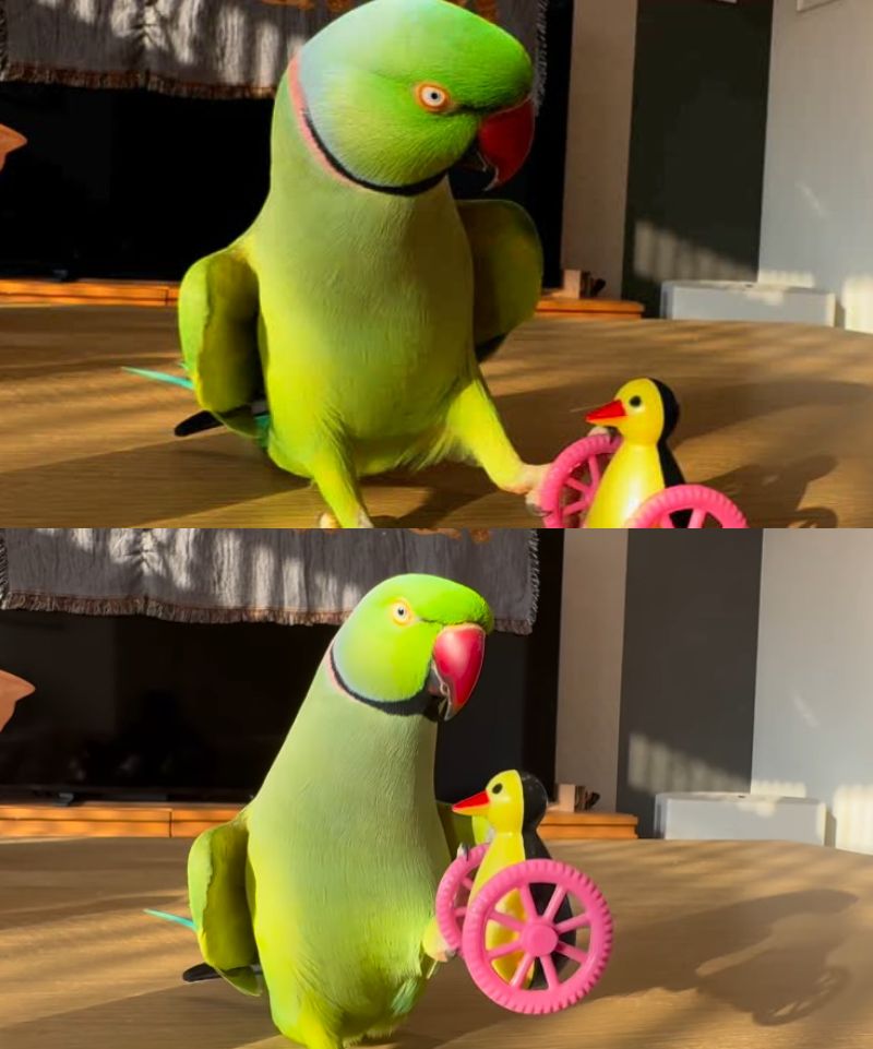 1. 【舌が長いインコ】ワカケホンセイインコのファフちゃん、大好きなおもちゃにする儀式?