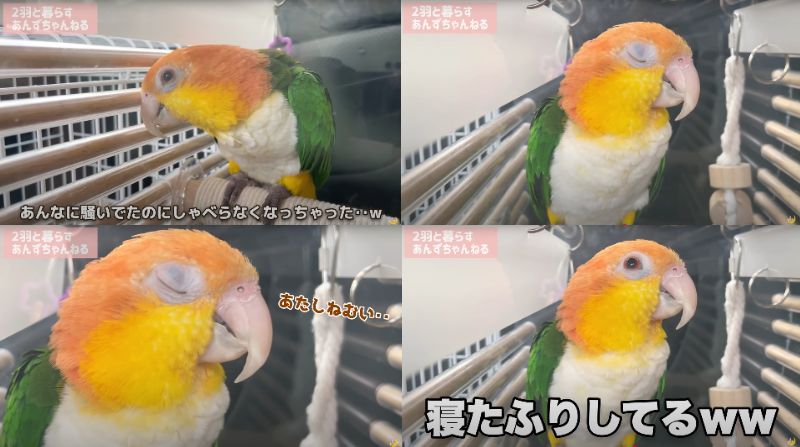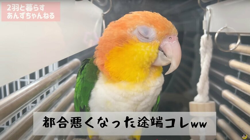 3. 【たぬき寝入りするインコ】「必殺!寝たふり」をするインコ!想像以上にしっかり目をつぶっております(笑)