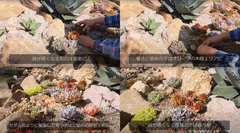 背の高くなる種類の多肉植物は背面に、暑さに弱い種類は木陰に、匍匐して這うように育つ種類は前面に、色と、その植物の特性と、高さと、形と、一度にいろんなことを考えながら植えなくてはいけません。