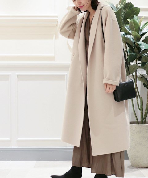 こちらもラムズウールを使った、人気のテーラードコート。「ワイドパンツ」や「マキシスカート」ともバランスをとりやすい絶妙な丈感に、首もとをすっきりと見せる細めの襟がポイント。
