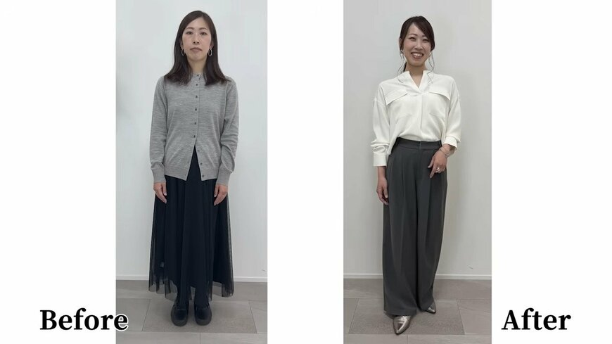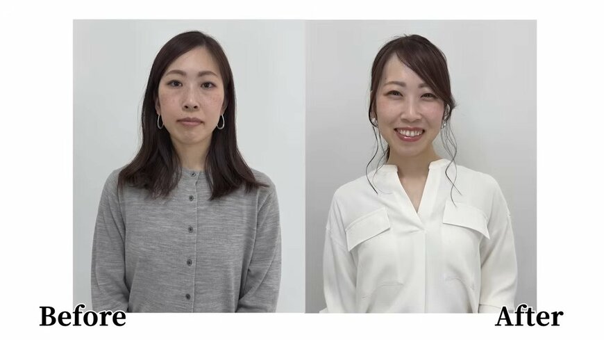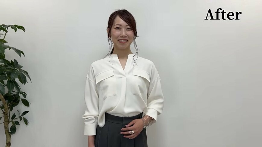 ビフォーアフターがこちら。爽やかな白のブラウスと抜け感のあるまとめ髪が似合うオシャレママへと大変身しました!変身後の満面の笑みも素敵ですね。