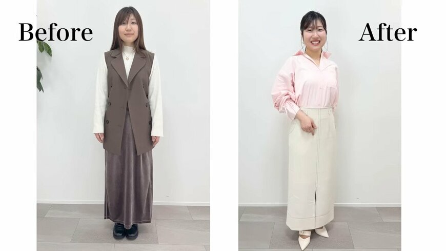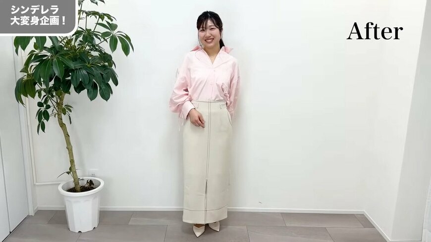 ビフォーアフターがこちら。明るいピンクシャツと白のタイトスカートにパンプスを合わせた、爽やかでかわいらしさと大人っぽさも感じられる素敵な雰囲気へと大変身しました。