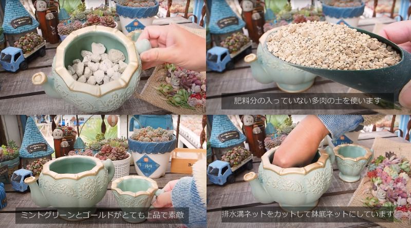 @oliveandsucculentgardenさんが寄せ植えに選んだのは、ティーポットとティーカップモチーフの鉢。